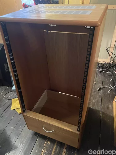 Studiorack i ekfanér med utdragbar låda, tillverkat av JB Musik. 16HE. Mått: Höjd: 106,5, Bredd: 53, Djup: nere 54, uppe 47. Utmärkt skick. Pris 1000Kr (Nypris 6000kr). Säljes av bolag